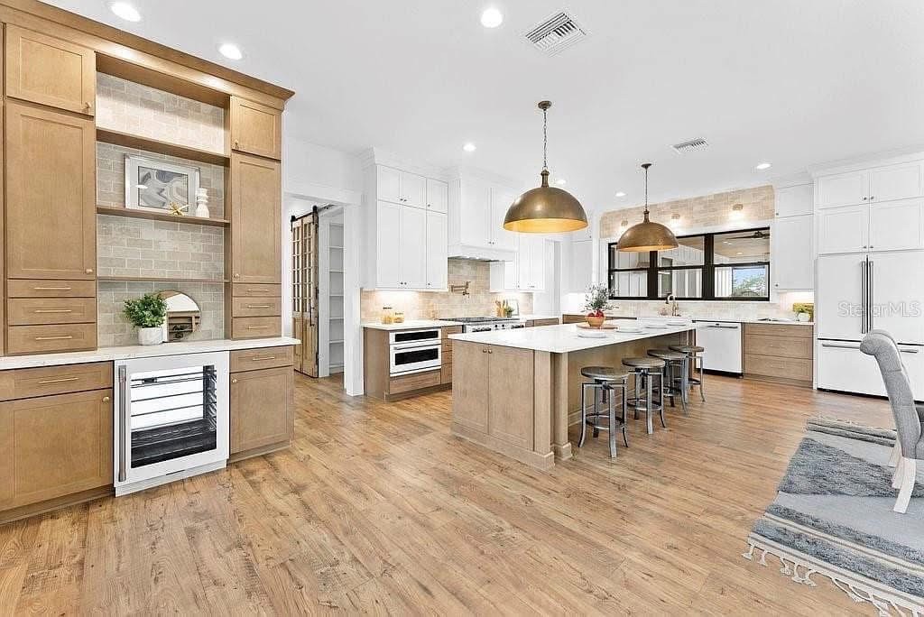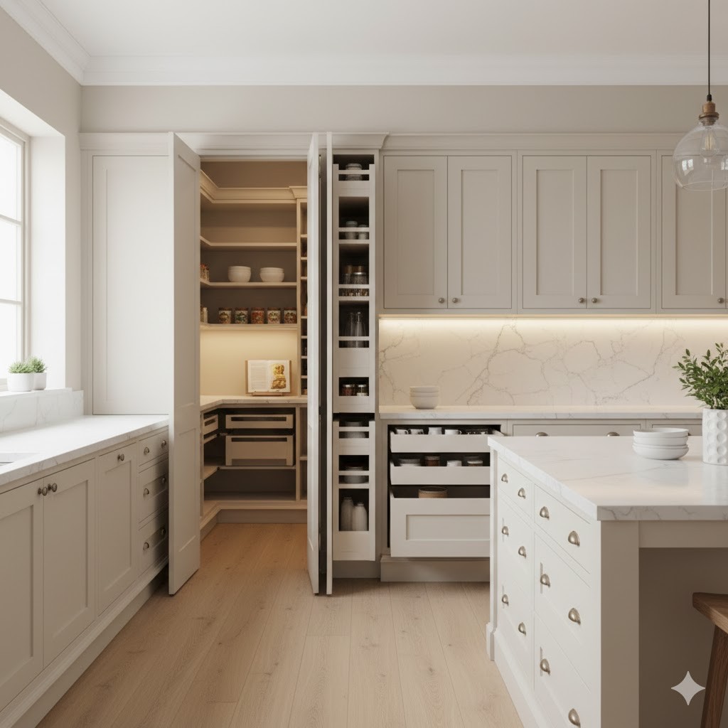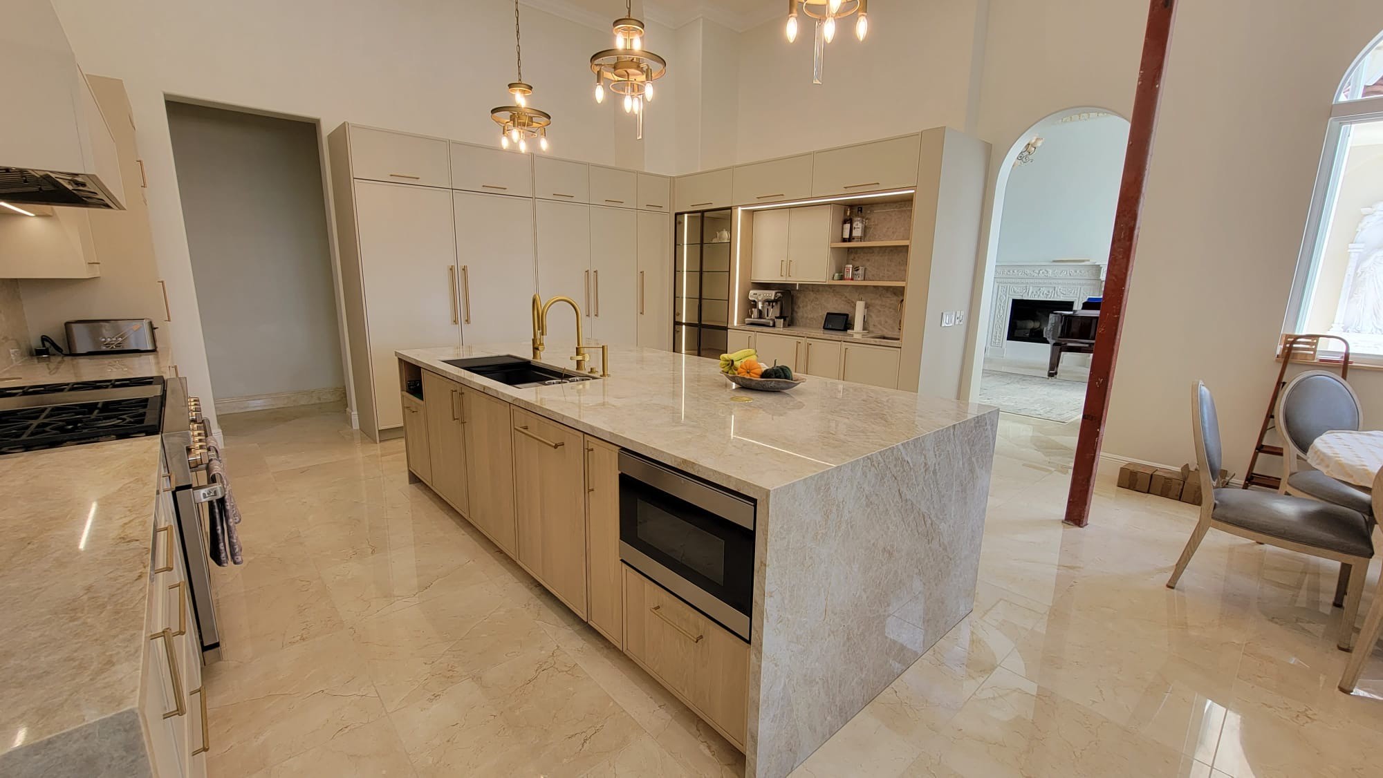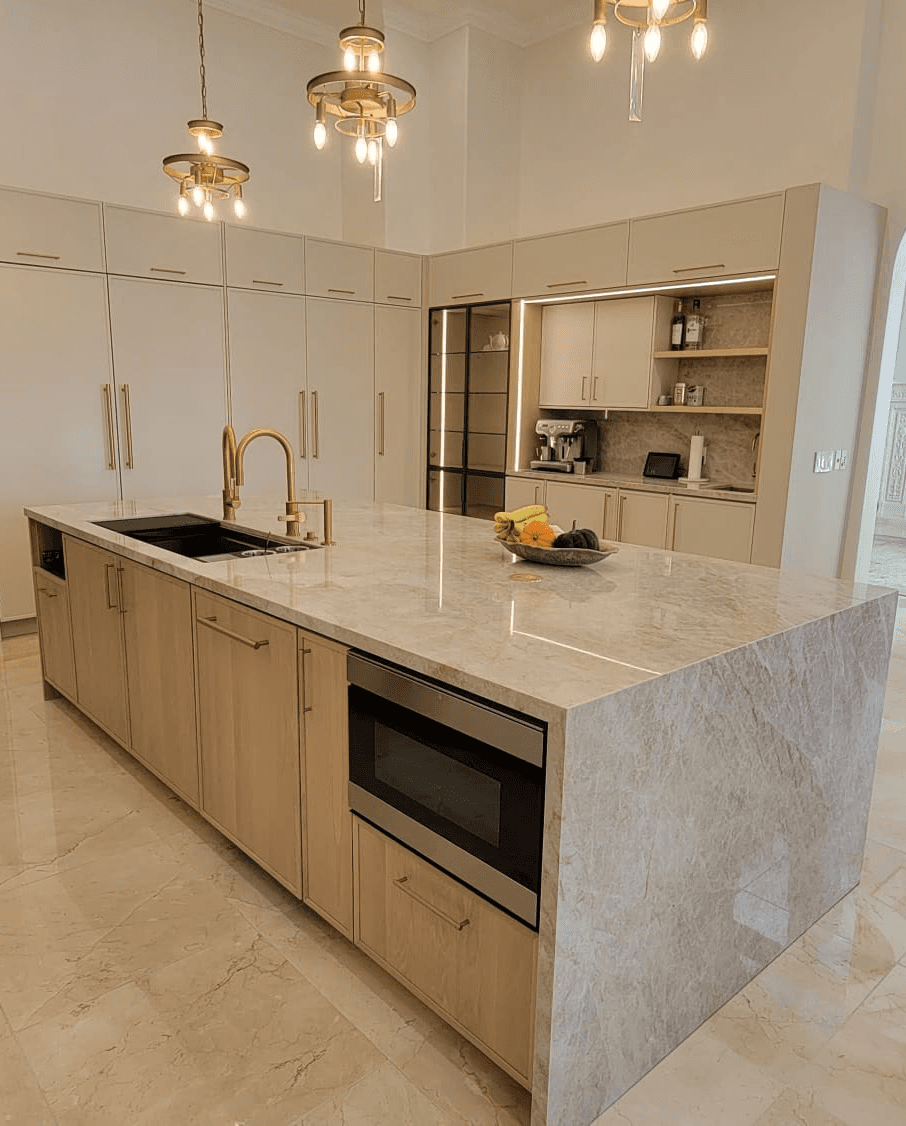 Modern transitional kitchen featuring full-height cabinetry, integrated storage, and a waterfall island finished in natural stone.